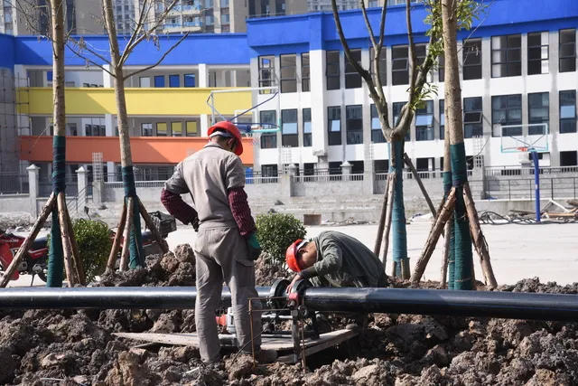 记者在内江市资中县春岚南路与资州大道交接处的凤凰教育园区小学部现场看到,工人们正在忙着种植花草树木,安装电缆管线、铺设瓷砖。
