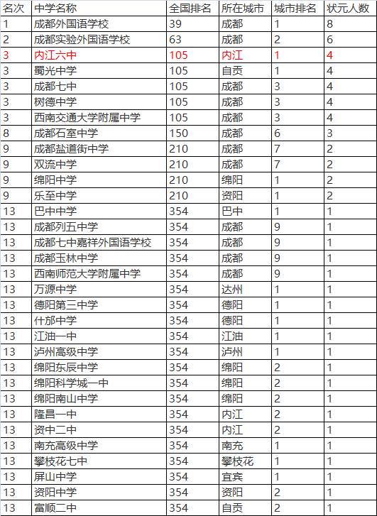 通过对1952-2015年中国大陆、香港和台湾两岸三地3000多名省级高考状元展开调查统计,2016年5月31日,艾瑞深中国校友会网最新发布了《2016中国高考状元调查报告》。在最新发布的2016西南地区顶尖中学排行榜800强中,重庆第一中学、重庆南开中学、重庆巴蜀中学名列2015重庆市顶尖中学排行榜前3强;成都外国语学校、成都实验外国语学校、成都七中、树德中学、西南交通大学附属中学、内江六中、蜀光中学名列2015四川省顶尖中学排行榜前3强。