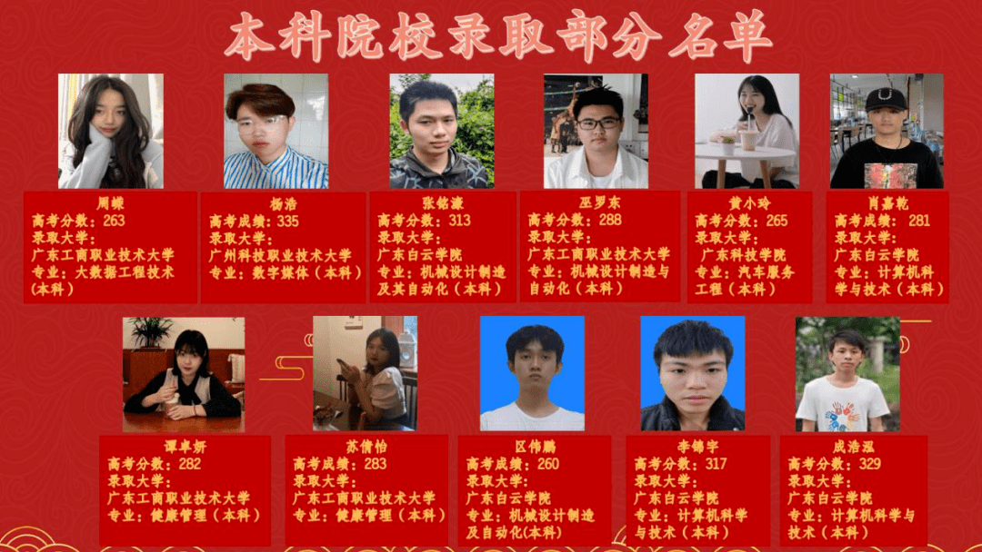 今年我校被深圳职业技术学校、广州番禺职业技术学校、顺德职业技术学院、广东轻工职业技术学院、深圳信息职业技术学院等十多所百强高职院校录取人数众多,前126名的同学都符合这些录取分数线,占比85%以上。