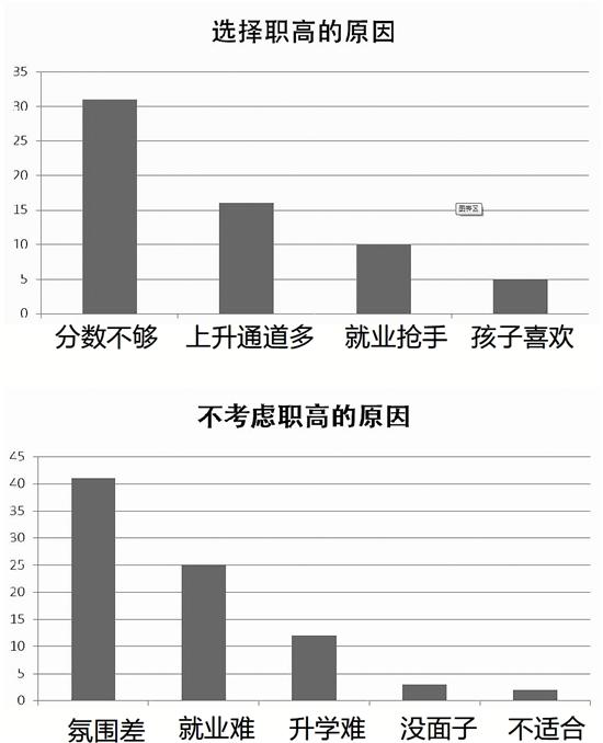 家长会送孩子读职高的主要原因包括:“考普高分数不够,实在没办法”,占31%;“现在职高的上升通道多,努力三年照样能读本科”,占16%;“就业市场上,优秀职高毕业生比许多大学生抢手”,占10%;“职高的专业,孩子特别喜欢,能扬长避短”,占5%。