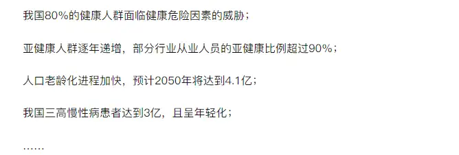 2016年10月25日国家发布《“健康中国2030”规划纲要》在这个规划中,明确提出,至2030年,健康服务业总规模达到16万亿,成为国民经济支柱性产业。