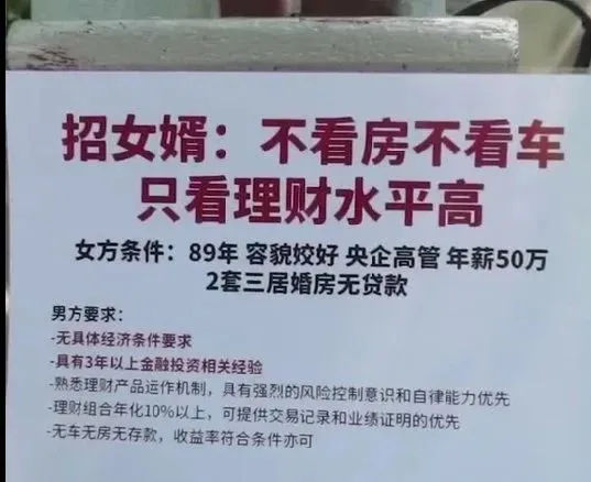 近日,在上海著名的相亲角,一位阿姨开出征女婿贴,要求具有3年以上金融投资相关经验,理财组合年化10%,可提供交易记录、业绩证明优先。