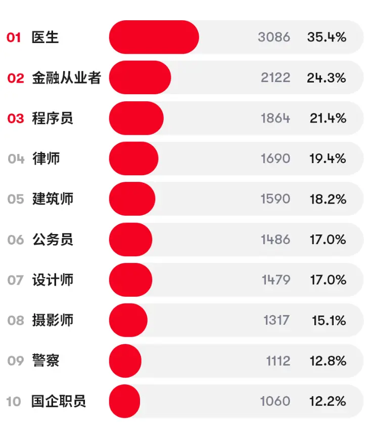 而在不同年龄段中,金融从业者仅次于医生,稳居TOP5。
