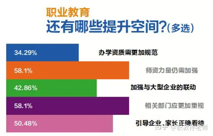调查问卷受访者认为,相关部门应更加重视、师资力量仍需加强,是目前职业教育最需要提升的部分。
