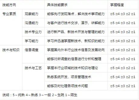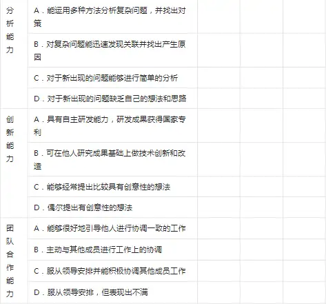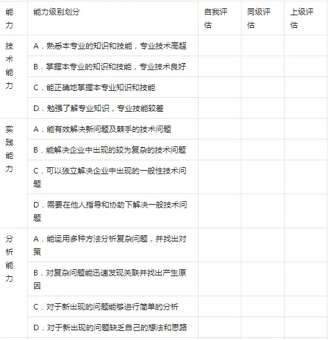 个人能力分析是培训需求信息的重要来源之一,下表为某科技公司制定的一张技术人员能力评估等级表。