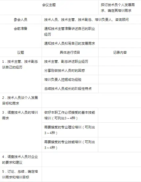 下表是一张座谈会表格的范本,用于挖掘技术人员的个人发展需求的信息。