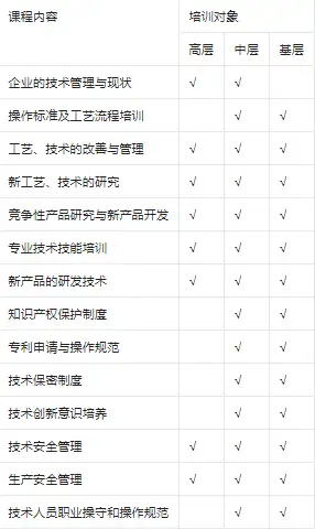 根据技术人员培训需求调查,技术人员培训课程设置的具体内容如下。