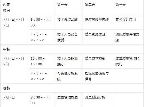 在培训开展前两天,人力资源部向质量工程技术管理人员发布培训通知。一方面确保所有接受培训的技术人员都能得到该通知,以便事前做好培训相关准备;另一方面也让受训技术人员提交安排好自己手头的工作,确保培训果不影响企业的正常运行。