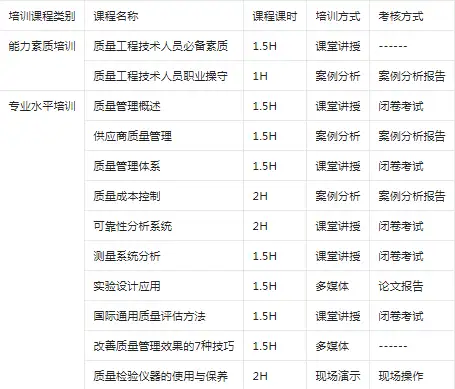 为确保培训目的的实现,针对质量工程技术人员培训,公司共设计了包括质量管理概述、供应商质量管理、质量管理体系、质量成本控制等内容在内的12门培训课程,如下表所示。