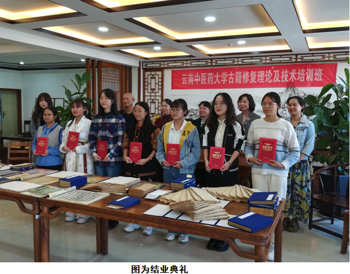 云南中医药大学是省内第一批配合古籍普查登记的单位。2020年,“中华古籍普查文化志愿服务行动·云南行”启动仪式在云南中医药大学举行,该校图书馆馆藏1425种、13171册中医药古籍入选了国家古籍普查目录;同年9月,由国家图书馆、云南省文旅厅主办,云南省图书馆、云南中医药大学图书馆承办的“中华传统晒书活动——滇南本草论坛”顺利举行。此后,云南中医药大学图书馆与云南省图书馆在古籍保护人才培养、古籍普查登记、古籍修复、古籍数字化、古籍整理出版和保护宣传推广等多方面一直开展深度的交流合作。通过此次培训,使参训学员不仅仅可以在病床前救治病人,也可以在图书馆中“照护”古籍,使修复成果更多惠及广大师生与人民群众。