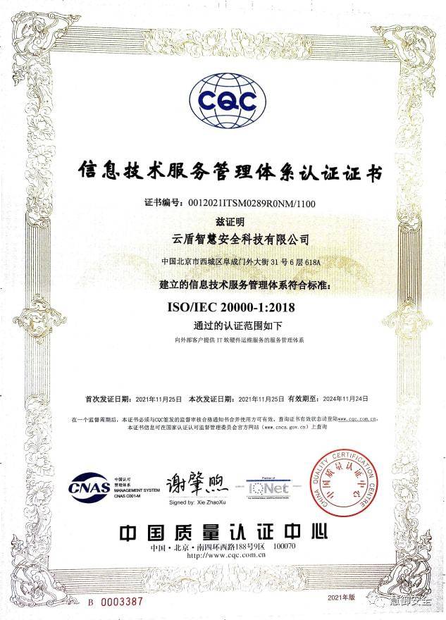 信息技术服务管理体系ISO20000证书