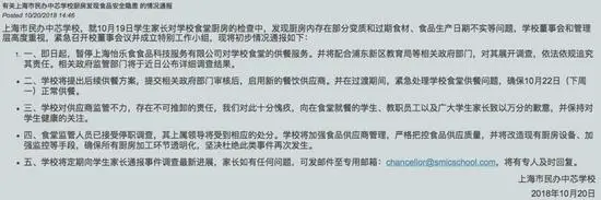 目前,学校已成立专门小组展开调查,上海浦东新区市场监管局也发布了通报,将焦点指向了学校食堂的供应商。
