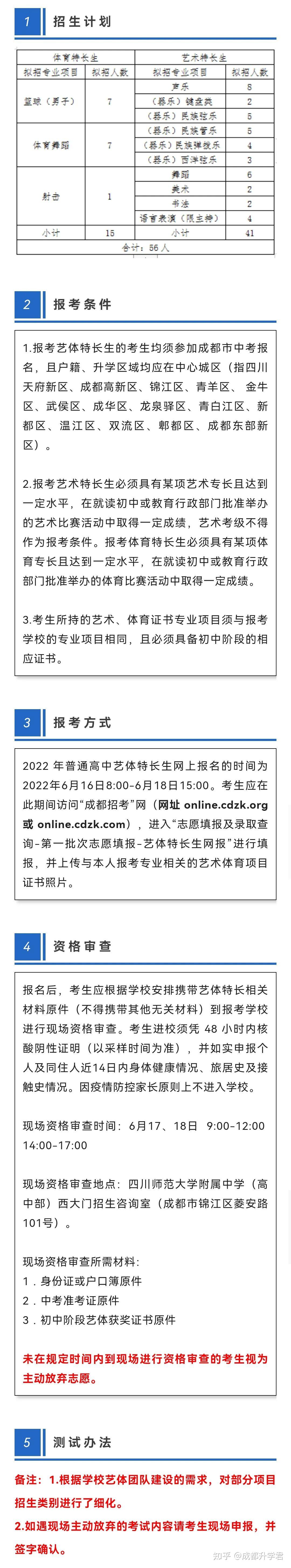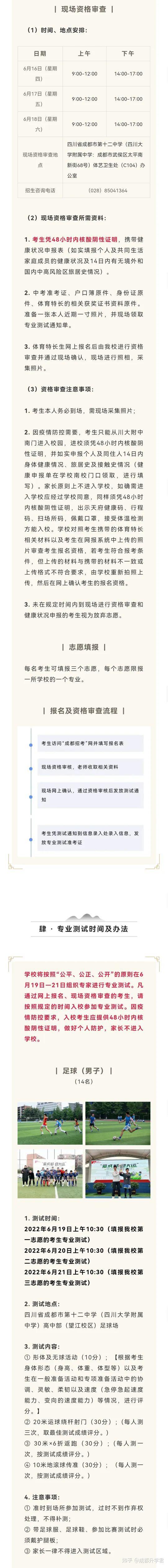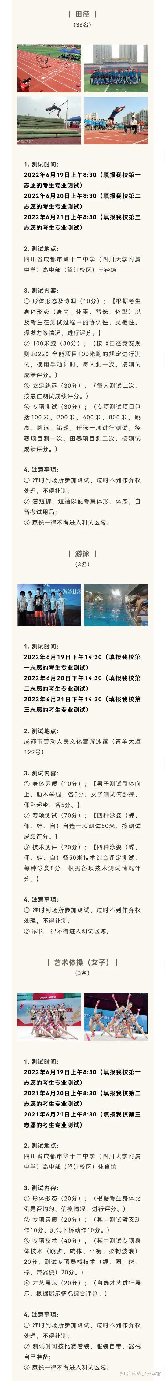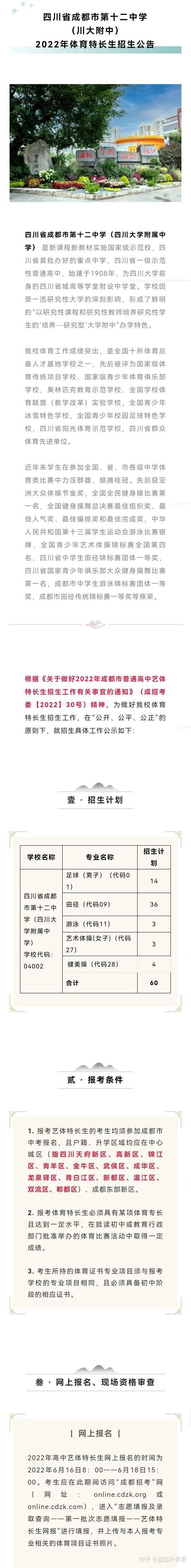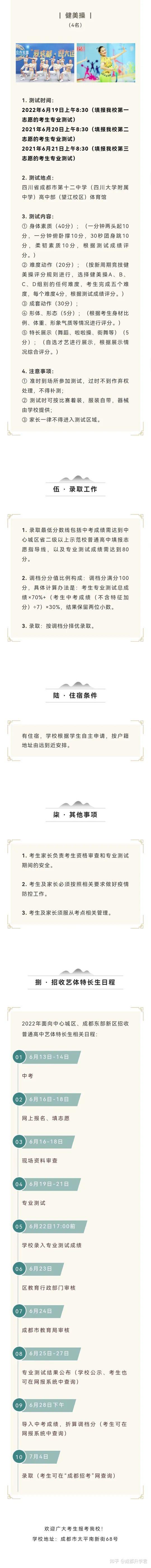 近期,成都市各高中学校正式发布2022年艺体特长生/艺体特长班招生简章。对今年招生计划、报考条件、报考方式、资格审查、测试办法、测试安排、录取办法等做了详细说明。壹牛现为大家整理发布各校“招生简章”,供参考。特别说明的是:2022年中心城区高中艺体特长生网上报名的时间为2022年6月16日上午8:00—6月18日下午15:00,也就是今天起就要进行相关报名,是否需要报考,需要大家根据自身情况做好安排。