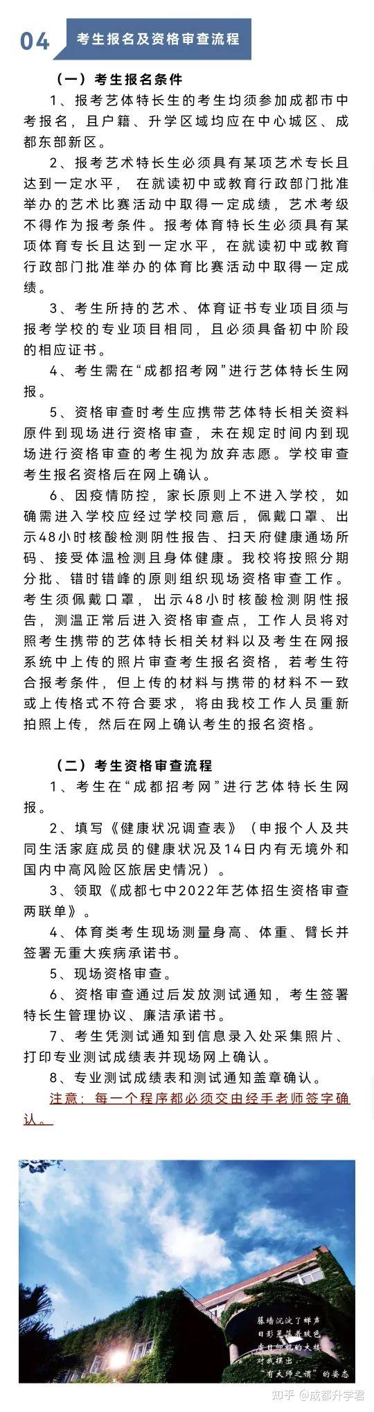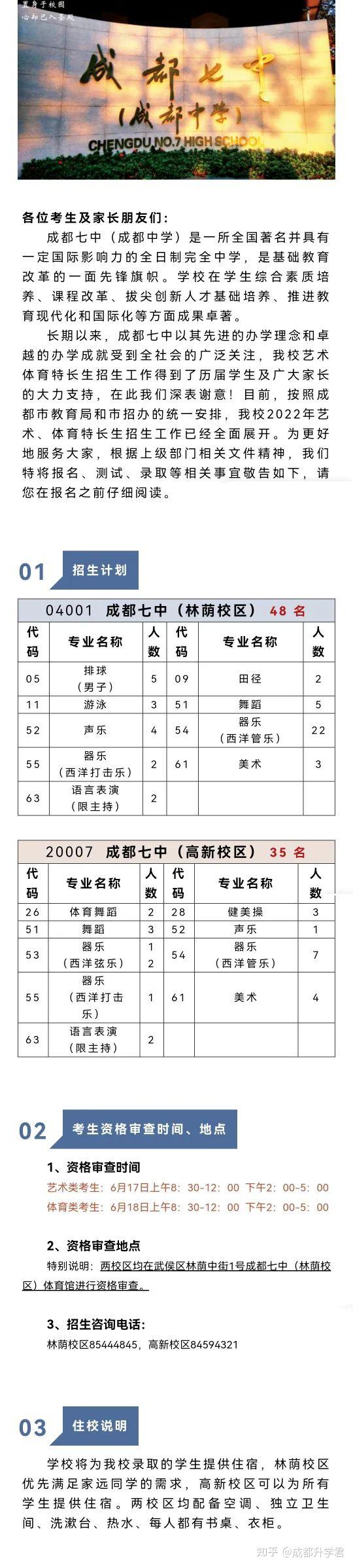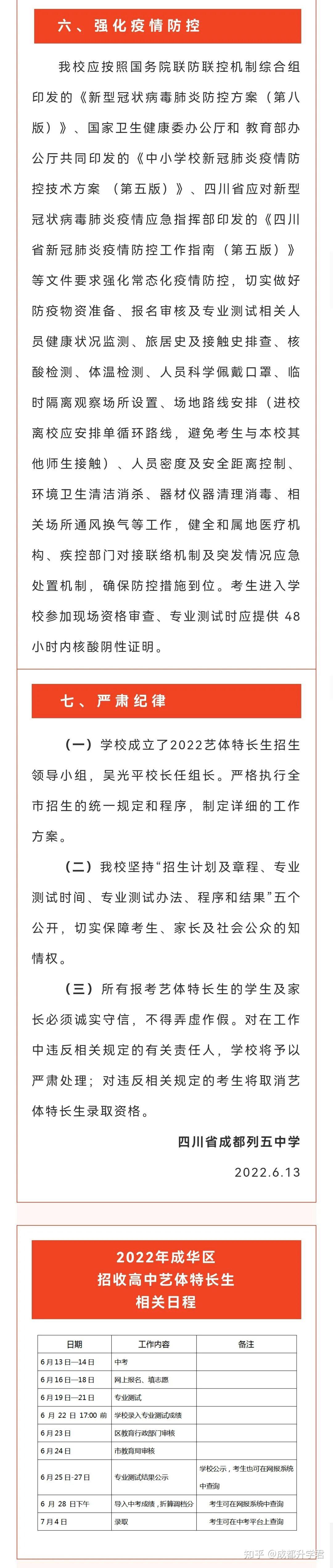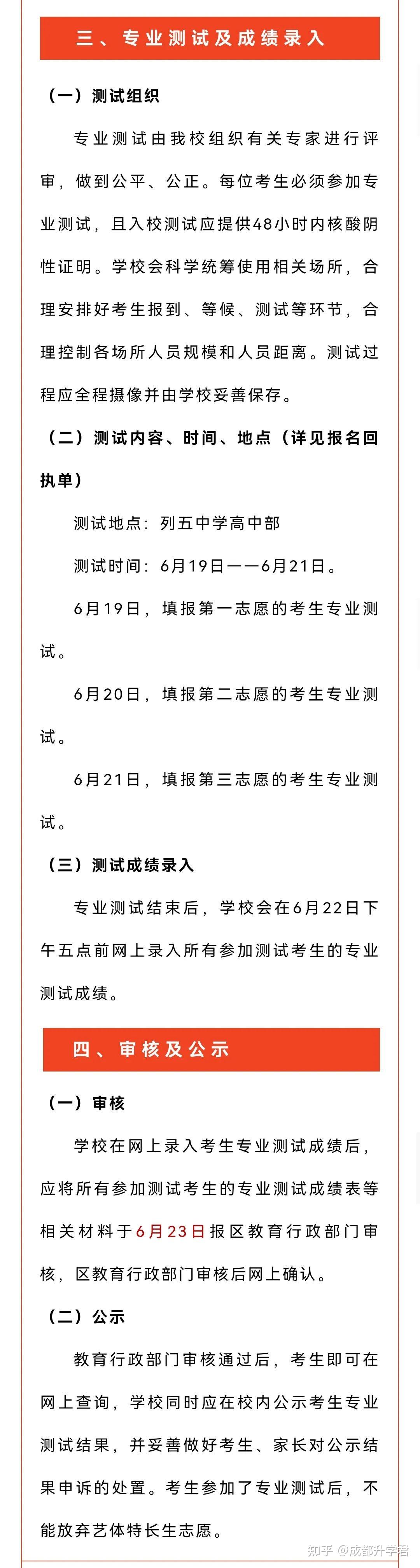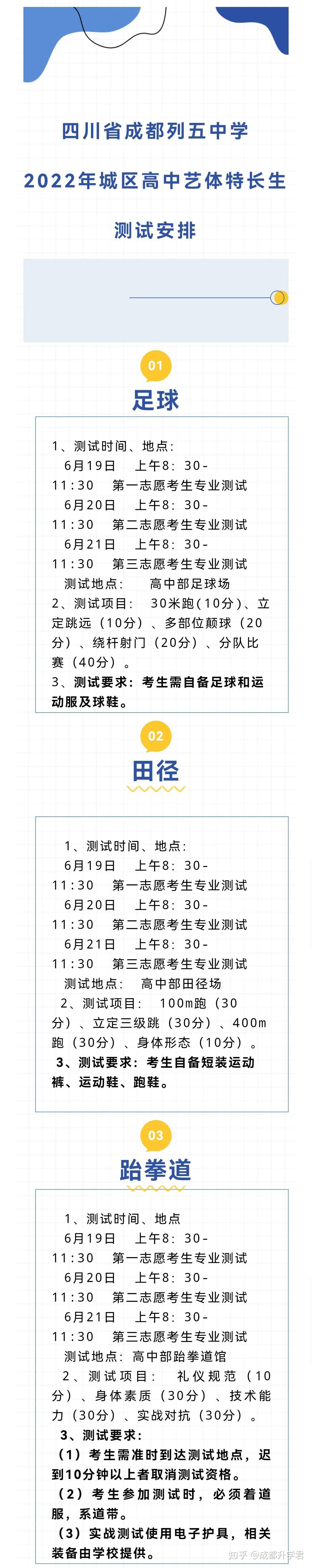 近期,成都市各高中学校正式发布2022年艺体特长生/艺体特长班招生简章。对今年招生计划、报考条件、报考方式、资格审查、测试办法、测试安排、录取办法等做了详细说明。壹牛现为大家整理发布各校“招生简章”,供参考。特别说明的是:2022年中心城区高中艺体特长生网上报名的时间为2022年6月16日上午8:00—6月18日下午15:00,也就是今天起就要进行相关报名,是否需要报考,需要大家根据自身情况做好安排。