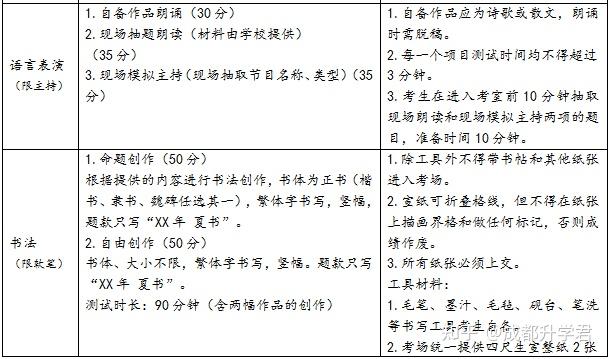 1.考生测试所需器材自备(乐器、练功服、舞蹈服、伴奏U盘、书画工具等)考试中如发生乐器出现问题、伴奏音质不清楚、无法正常播放等问题,一律由考生本人负责。