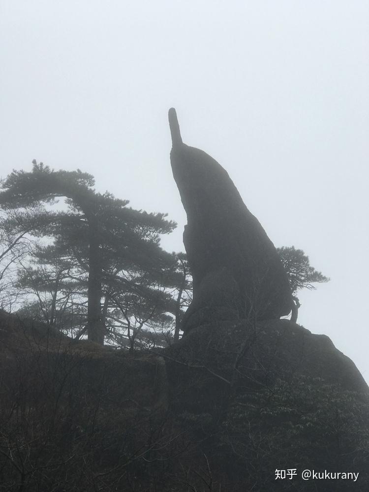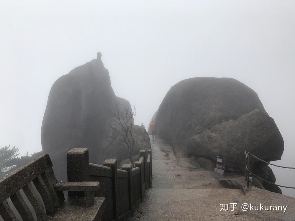 之后到莲花亭(莲花峰2014年就关闭了),之后是百步云梯,从这里往下走,大约12:40,看起来险,是因为窄,但并不难走,台阶并不陡峭。这附近路上看到一些怪石。黄山几乎每座山峰上都有怪石,其形成期约在100多万年前的第四纪冰川期,已被命名的怪石有120多处,其形态各异。黄山怪石从不同的位置,在不同的天气观看,可谓“横看成岭侧成峰,远近高低各不同”。