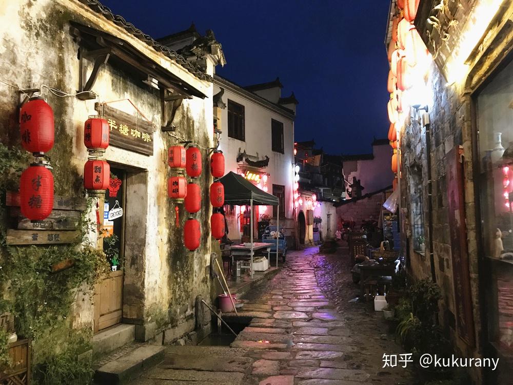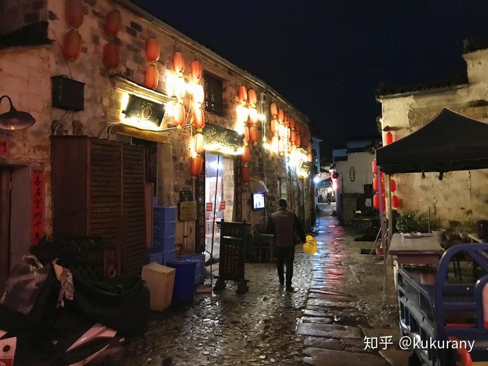 到5:20回到宏村停车场,自己往回镇里方向走,路上在镇子外的餐馆吃饭,其实并不比镇子内便宜。和客栈餐厅的菜单比,同样的菜价格是完全一样的,估计是整个景区统一协商的结果。点了一份炒粉丝,一碗饭,一共30元。进宏村镇子里果然要查票、核对身份证。虽然天色已黑,我还是在宏村镇里遛了弯才回去,很多家门口挂了红灯笼,相比较其他古镇,宏村算很安静的,酒吧并不太多,也不吵闹,就算在南湖、月沼周围,也没有太多人。也可能是因为淡季的缘故