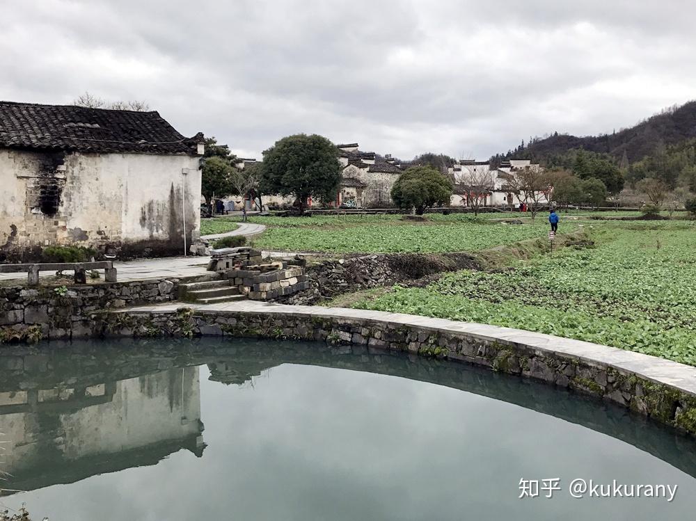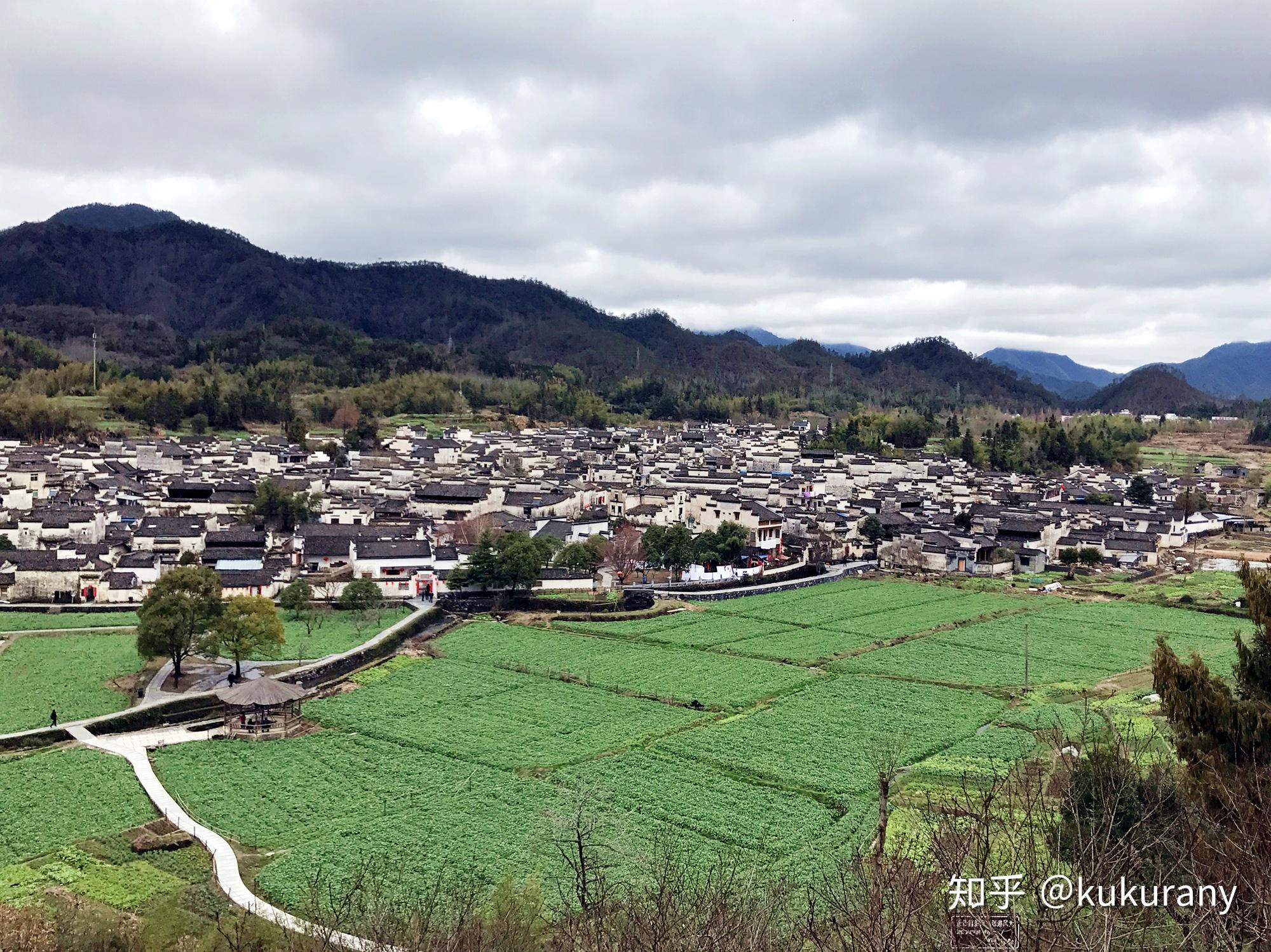 跟着讲解员走了一圈,之后自己又再转了一圈,拍拍照,仔细看看。然后到后边溪,南边是观光园区,有个小山,山下是绿油油的菜地,和建筑群的白墙黑瓦形成鲜明的对照。爬上小山有观景台,可以俯瞰西递全景,只是天气阴沉沉的,光线不好,不适合拍照