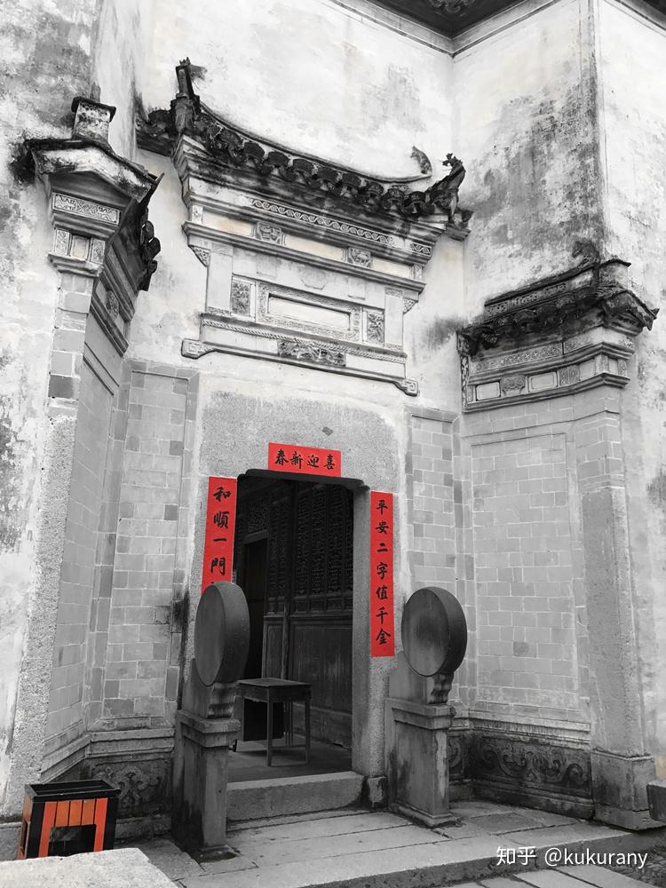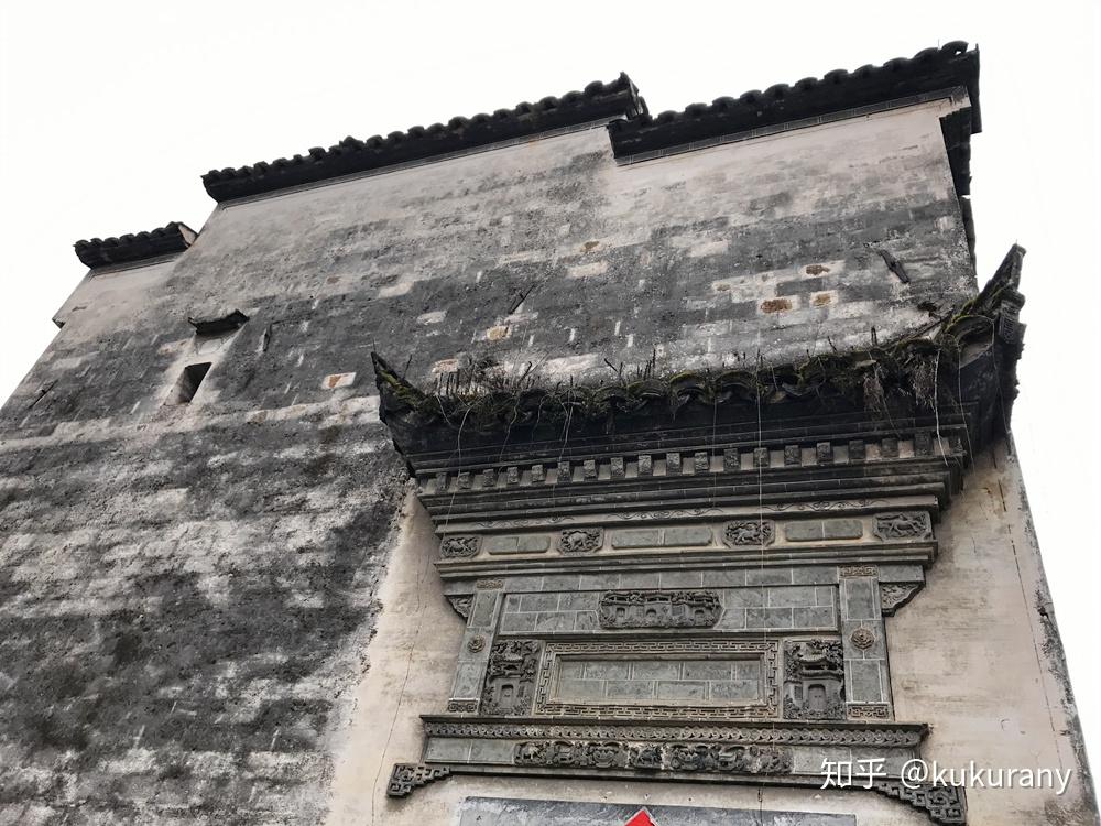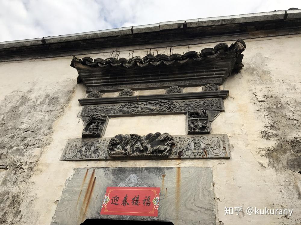 大门和门楼:徽州建筑大门均用黟县青石做框,且均配有门楼(规模稍小一些的称为门罩),主要作用是防止雨水顺墙而下溅到门上。一般农家的门罩较为简单,在离门框上部少许的位置,用水磨砖砌出向外挑的檐脚,顶上覆瓦,并刻一些简单的装饰。富家门楼十分讲究,多有砖雕或石雕装潢,以花鸟虫鱼或历史场景为题,各有寓意。