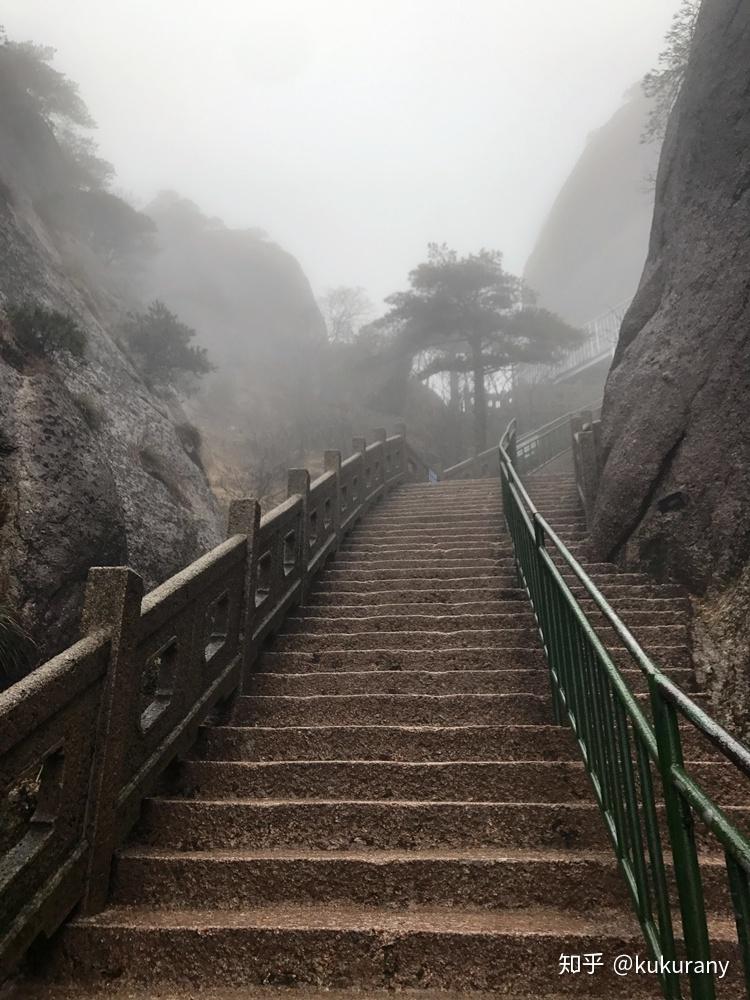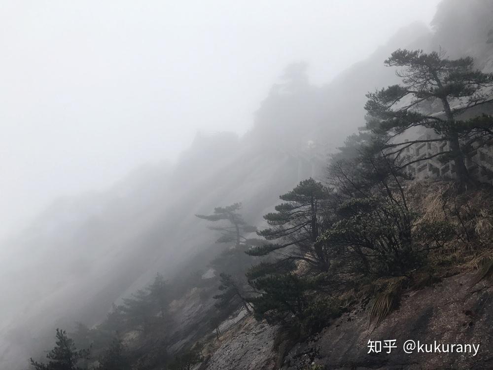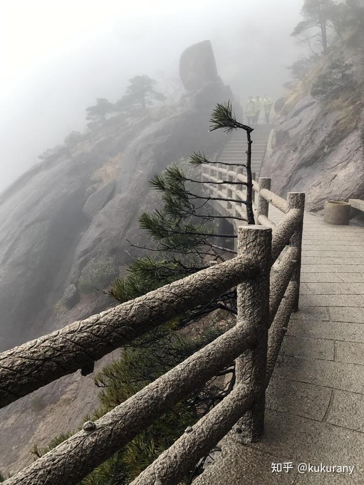 玉屏索道出来就上好汉坡,一大段爬坡。雾始终都很大,可以看近处的岩石、松树,但稍远的大、小山峰都看不到。