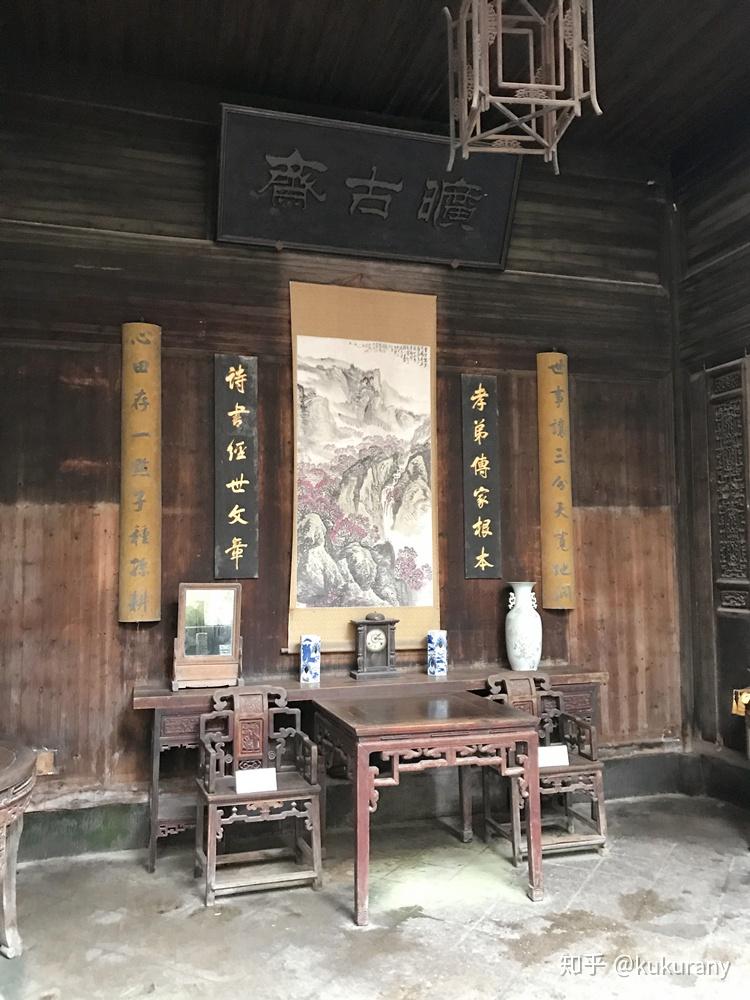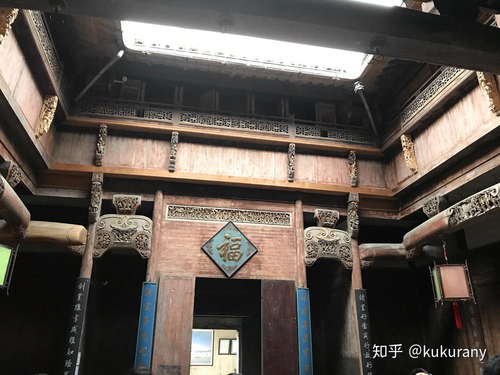 跟着讲解员走,就来到旷古斋。建于清代康熙元年(1662年),占地面积130平方米,房子原来的主人是一位曾经商也曾入仕的本地名人(直接说是买官的不就行了么...)。房屋为上下两层楼,左右三开间,两边为东西厢房。比较有特点的是大堂中央、两边柱子上挂着多幅家训楹联。讲解员还点出建筑的一些细节,例如正门进来走两步,地上有小凹槽,关大门后可以用木棍斜顶住,是防盗用的。西递这里很多民居虽然开放给游人参观,本宅的主人也还是住在里面的,所以有些区域是禁止游客进入的,也可以看到本宅的主人在忙前忙后,有些老人坐在椅子上晒太阳,安详地看着过往的游客