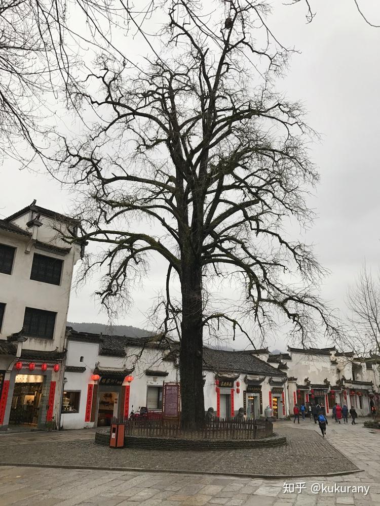 跟着讲解员走完一圈,感觉是总体上宏村的建筑比西递少,大部分也不如西递气派。到了村口大树这里,我刚才也是从这里的宏际桥进村的。这两棵大树,已有500年树龄,北侧一棵枫杨,当地叫红杨树,南侧一棵银杏树,当地叫白果树。红杨树也叫枰柳、麻柳等,落叶大乔木,有小坚果果实,两端具翅。此红杨树高19米,围6米,需4、5个人才能合抱,树冠形状像一把巨伞,把这村口数亩地笼罩在绿荫之中。南侧的白果树属于裸子植物落叶乔木,寿命极长,是现存种子植物中最古老的孑遗植物,被称为“活化石”,此处这棵高20米,形如利剑,直刺天空。这两棵大树是这牛形宏村的“牛角”,宏村的“风水树”,也是一种吉祥的象征。按照这里过去的风俗,村中老百姓办喜事,新娘的花轿要绕着红杨树转个大圈,这预示着新人百年好合,红福齐天;高寿老翁辞世办丧事,要抬着寿棺绕着白果树转个大圈,寓示着子孙满堂,高福高寿。