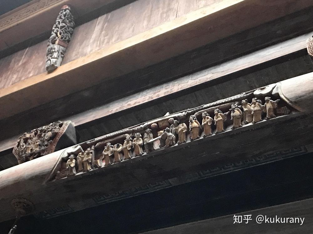 前厅是承志堂中最精华的部分,大门后面耸立着一幅威仪的中门,在中门“福”字的上方,镶有一幅木雕“百子闹元宵”图,图上雕刻着100个小男孩过元宵闹花灯时的情景,这正是古代“多子多福”传统观念的生动写照,“百子闹元宵”图两边的“商”字斗拱上则分别雕有四出《三国演义》的戏文,斗拱的上方雕有“南、北”财神,财神的上方是阁楼护板,在此,汪定贵设计了“渔、樵、耕、读”四根木雕立柱,分别代表了古代的四种职业。