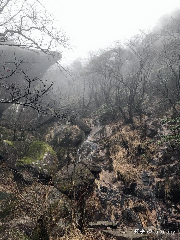 11:30从索道上站出来,开始走山路。一开始有小雨,我就穿上雨衣了,后悔没在山下买个鞋套,鞋子很快就湿了,还好穿了两层袜子,不会湿透到脚。后来雨停了地面仍然很湿,有山上流下的水流淌漫过。今年已经下过雪了,但在山上却很少见积雪。山上石台阶路是后来修的,不是1979年邓老人家爬山的老路。一路常见到有滑杆拉客的。