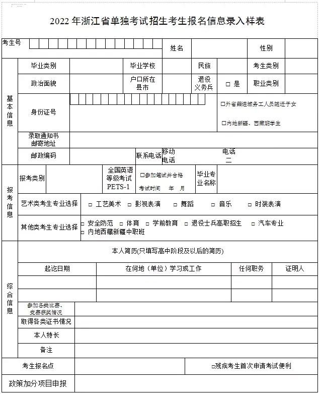 附件2.《2022年浙江省普通高校招生考试考生报名信息录入样表》及有关栏目说明