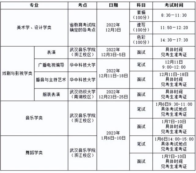 湖北省2023年艺术类各专业统考的考试时间安排见下表,考生面试具体考试时间以准考证时间为准。