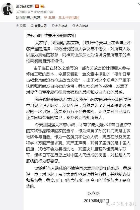 意识到事情严重后,赵立新马上删除了自己之前的言论,并发布了道歉声明。