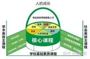 两翼:指学术类自主课程(基于智慧发展)和社会类自主课程(基于人格成长)的两个通道。