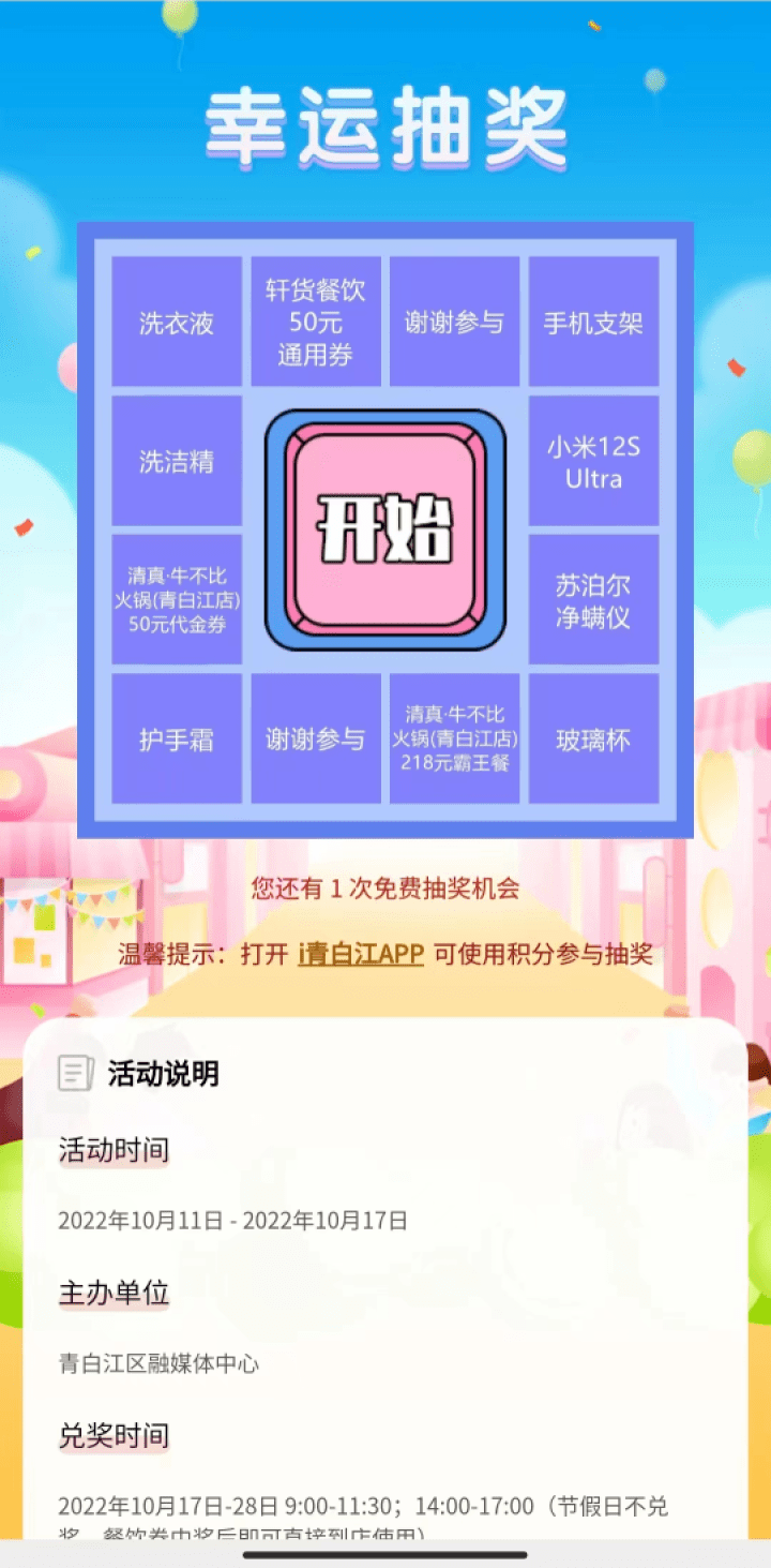 (3) 微信账号每日可参与一次,“i青白江”APP用户每日可额外免费参与1次,还可通过“i青白江”APP积分兑换 次数参与(不限次数)。