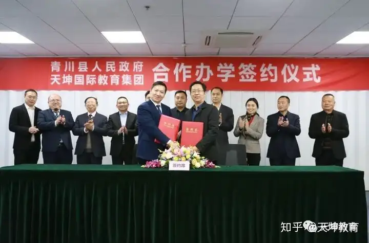 2017年3月20日,青川县人民政府与天坤国际在上海签订合作办学协议,青川职高成为天坤集团旗下的合作学校。天坤集团入驻学校后,参与学校的日常管理、招生、教学、专业改造、学生管理的全过程。并采取PPP合作、集团化办学的模式,立足市场需求,科学设置专业,在数控技术应用、汽车运用与维修、旅游服务与管理、计算机应用、电子技术应用、会计等专业的基础上,增加了高级乘务、手机与平板电脑维修技术、工业自动化机器人技术三个特色专业方向,让学生学到最前沿的技术、练就最前沿的技能、获得最好的就业岗位、实现可观的工资收入、为社会创造更多的贡献。经过三年来的合作办学,学校办学理念更加先进,师资队伍更有活力、日常管理更加精细、学生发展更加多元化。秉承着目标招生就是招工,毕业立即就业。教学质量过硬,高考升学显著。强化专业拓展,多点多极融合。特色课程丰富,青春活力彰显准军事化管理,培育职业精神。