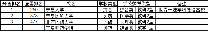 2020年评价宁夏回族自治区13所普通本科大学。宁夏回族自治区大学教师学术水平0.3509,全国第26名,教师绩效0.5269,全国第27名。