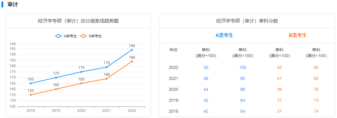 从下图可以看到,教育专硕的国家线是逐年递增,2018年时,A区考生的国家线为320分,B区考生的国家线为310分。随后以每年比前年多5、6分的形式递增,而到2022年时,国家线出现了拐道,狂增了14分,几乎震惊了教育界的各路考生,微博也是上了各大热搜。