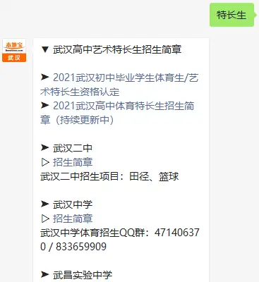 温馨提示:微信搜索公众号武汉本地宝,关注后在对话框回复【特长生】可获取2022武汉各高中体育生、艺术生招生简章、报名条件及时间、咨询电话等。