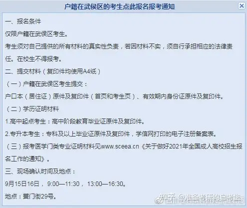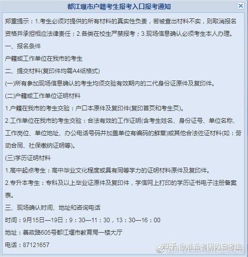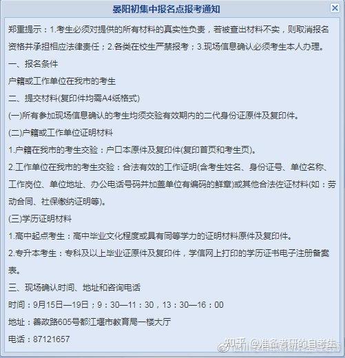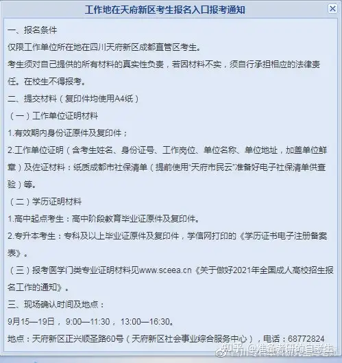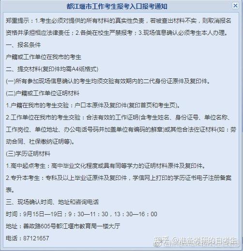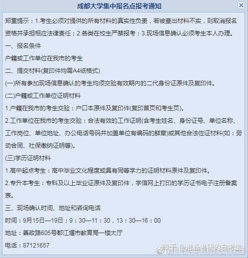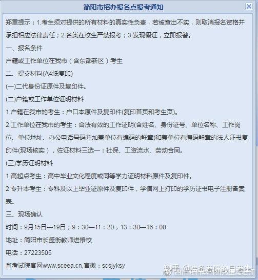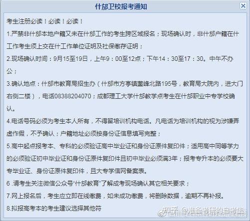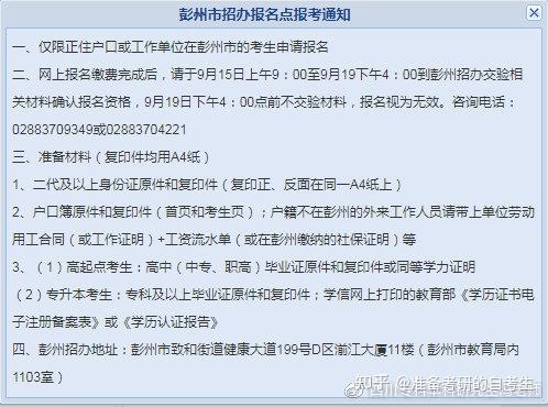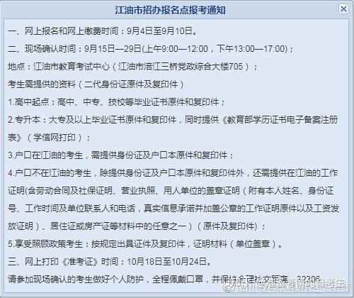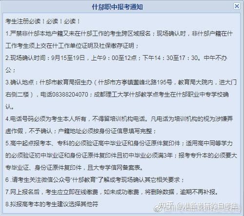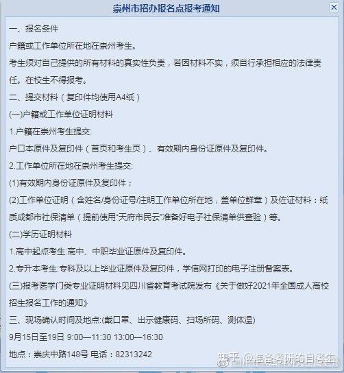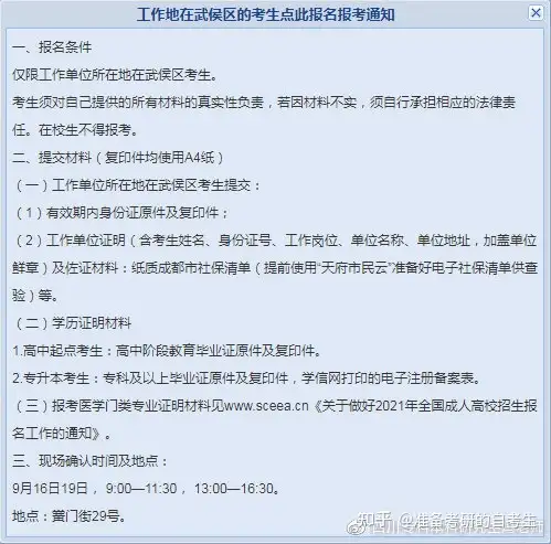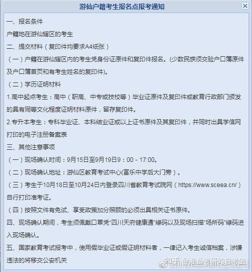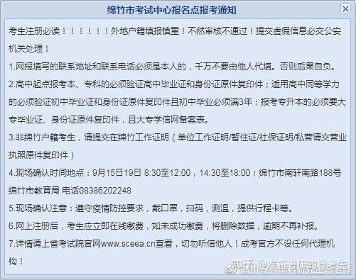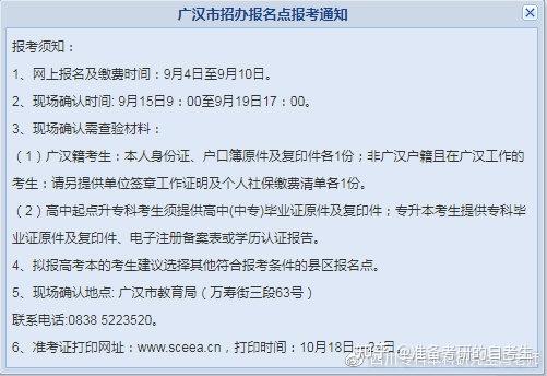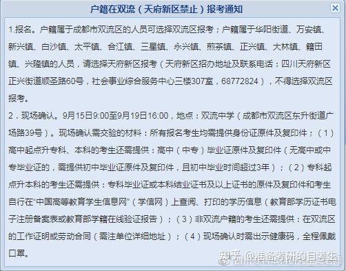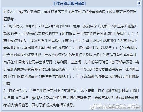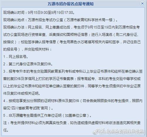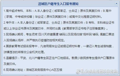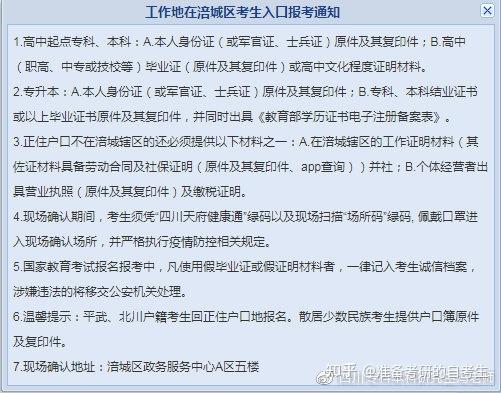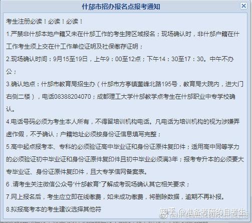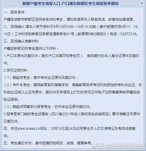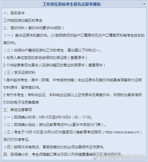 ◆报名地点 考生应在正住户口或工作单位所在地的县(市、区)招生考试机构报名。确需在非户口所在地报考的,原则上应该在工作或居住所在地报考,并须提供在当地工作、生活的有效凭证,如社保缴费证明、居住证、房产证等;享受地区性照顾加分的考生,必须在正住户口所在地招生考试机构报名,否则不予享受相关照顾政策;定居在四川省并具备报名资格的港澳居民持《港澳居民来往内地通行证》或《港澳居民居住证》、台湾居民持《台湾居民来往大陆通行证》或《台湾居民居住证》、外国侨民持《外国人永久居留证》,可在居留地报名。