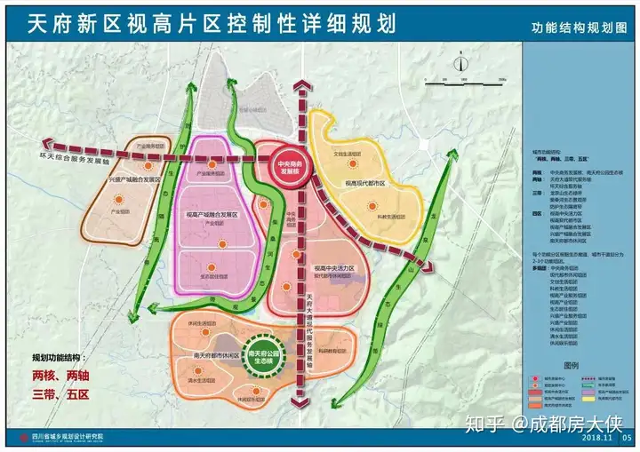 2018年11月,仁寿发布了《天府新区视高及周边地区一体化发展总体规划、天府新区视高片区控制性详细规划》,以北联、南接、东控、西拓为发展思路,以“两核、两轴、三带、五区”为功能架构。