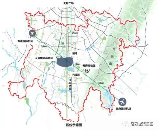 天府中央商务区位于天府大道南端,居于整个天府新区的核心位置,位于麓湖和兴隆湖之间,该区域正好处于双流国际机场和天府国际机场连线的中心位置,同时,距离规划中的天府高铁站仅9公里。
