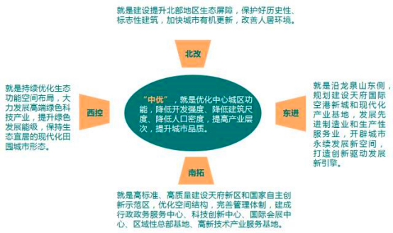 2017年7月2日,成都国家中心城市产业发展大会透露,成都决定打破圈层结构,将中心城区范围扩大至原一二圈层的 11 个行政区加高新区、天府新区,形成“中心城区+郊区新城”的空间层次,进一步疏解城市核心区非核心功能,带动全域均衡协同发展,由此形成“中心城区+郊区新城”的空间层次。同时在全成都市统筹布局建设66个主导产业明确、专业分工合理的产业功能区,全面提升城市能级。