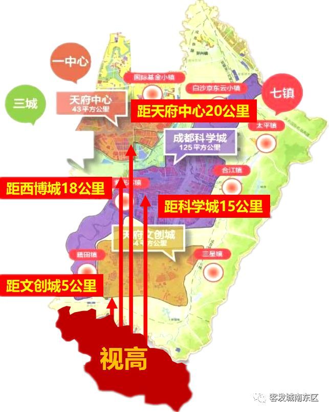 科学城与主城区直线距离约28公里,与新机场约38公里,而主城区距离新机场则约有58公里。未来的高铁-成都天府站,就落子于科学城东部。