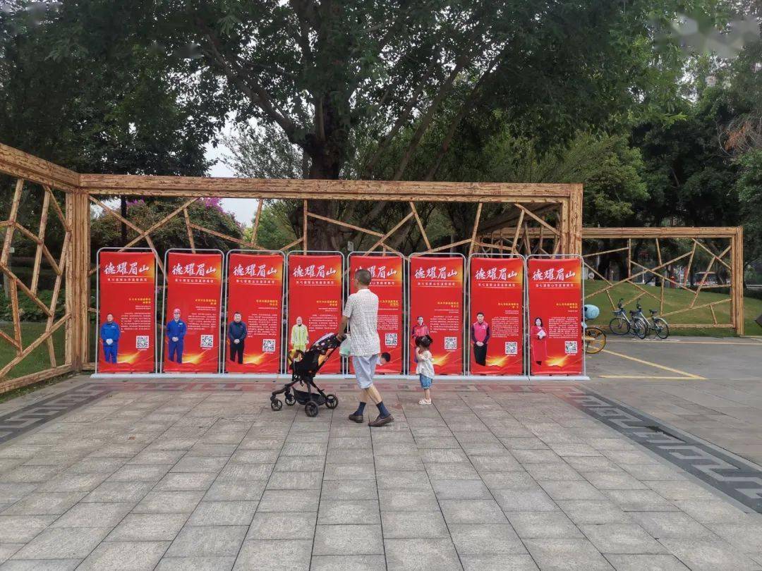 文字描述:近日,眉山城区苏辙公园,一位市民带着小朋友一起观看道德模范事迹展出。
