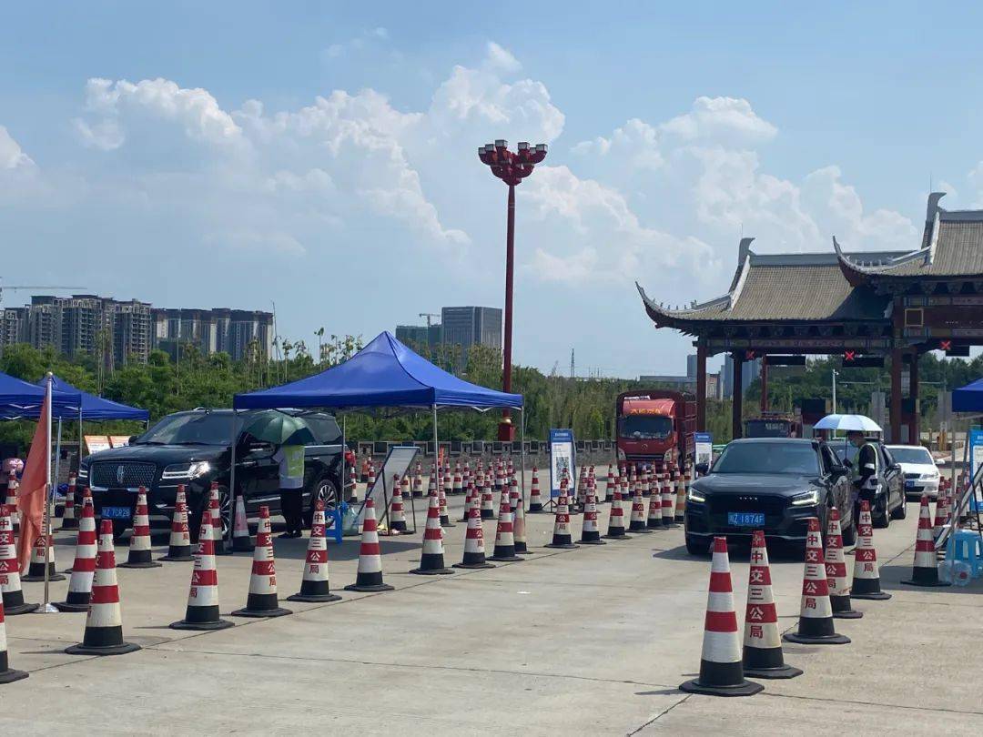 文字描述:8月14日,在进入眉山的一高速路口处,来眉车辆和司乘人员在现场工作人员和志愿者的指引下,正在依次扫码、亮行程卡、测温等。