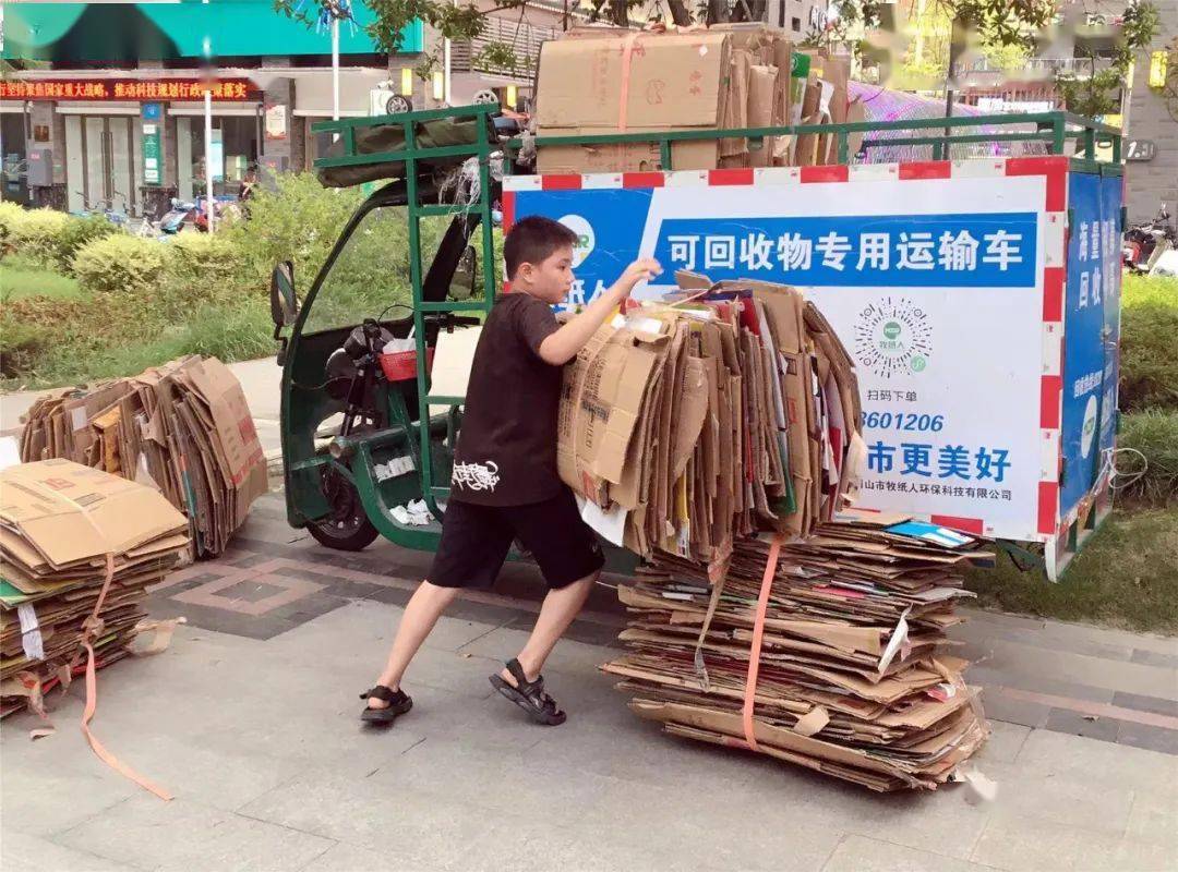 文字描述:近日,在东坡区岷江生活广场外,一辆“可回收物专用运输车”旁,一位十几岁的少年正在试图把纸箱装上车。