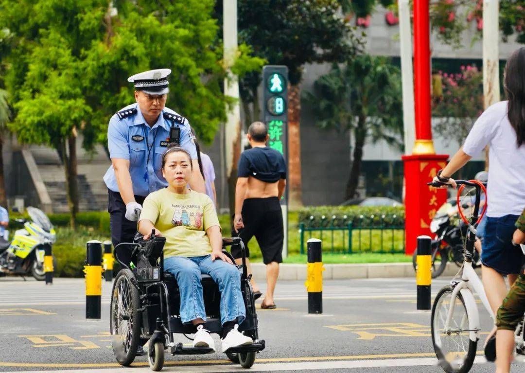 文字描述:近日,在眉山城区一处斑马线前,路边执勤的交警将轮椅上的行人护送着过马路。