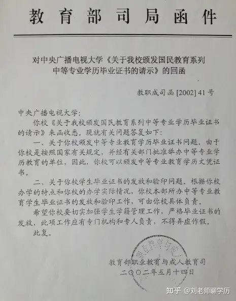2、正规性:电大中专,全称中央广播电视中等专业学校是一所经原国家教委批准,现由教育部职业教育与成人教育司领导并依托国家开放大学(原中央广播电视大学)设置的中等专业学校,其主要职责是负责全国电大系统中等职业教育的教学和教学管理方面的统筹协调、指导服务和评估监督,并直接面向社会、面向基层、面向农村举办中等职业教育。学校具有颁发国民教育系列成人中等学历教育毕业证书的资格。(下方图片为教育部关于我校颁发国民教育系列中等专业学历毕业证书的回函及教育部关于电大中专文书)
