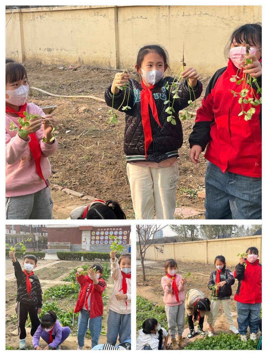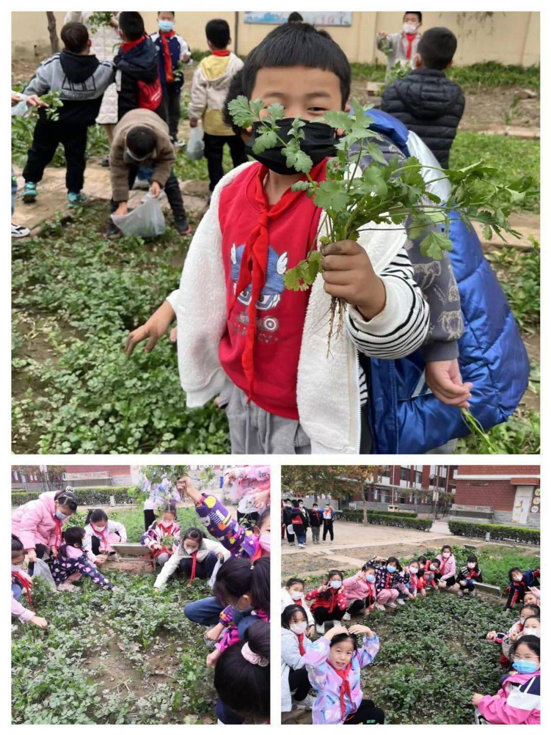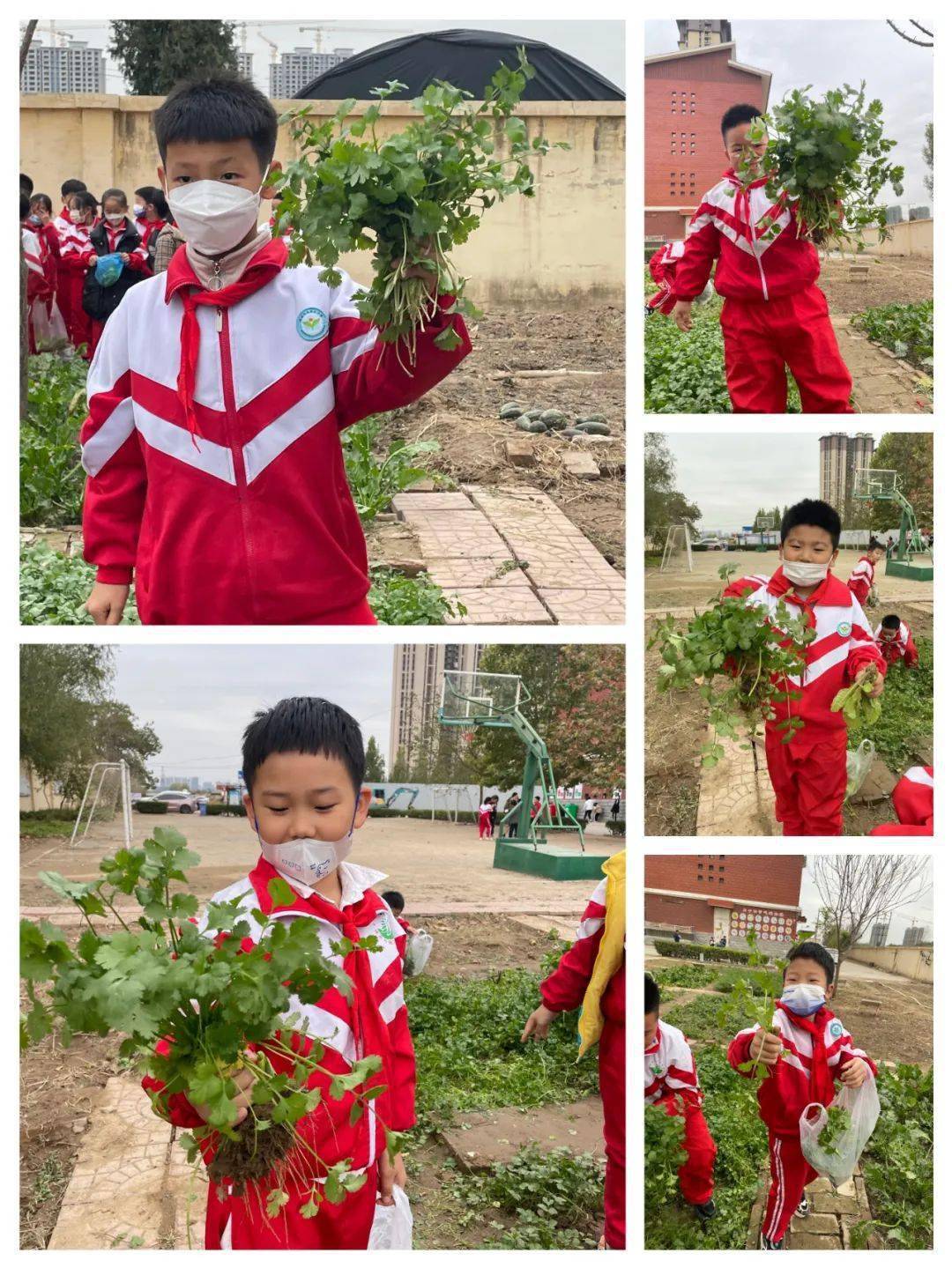 中年级的同学们围在了小白菜地边,在老师的指挥下开始有秩序地拔菜,抓住根部,用力一拔,连带起的泥土都散发着香甜的气息。还有的班级在老师的带领下开始拔起了胡萝卜,每位同学脸上都洋溢着丰收的笑容。