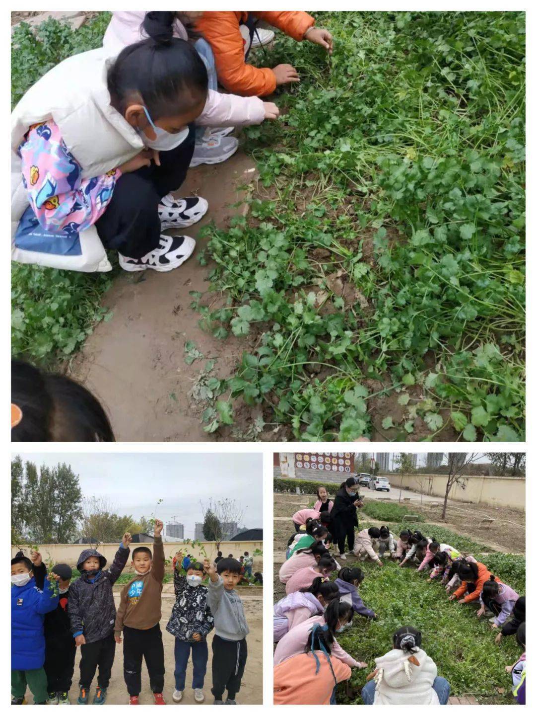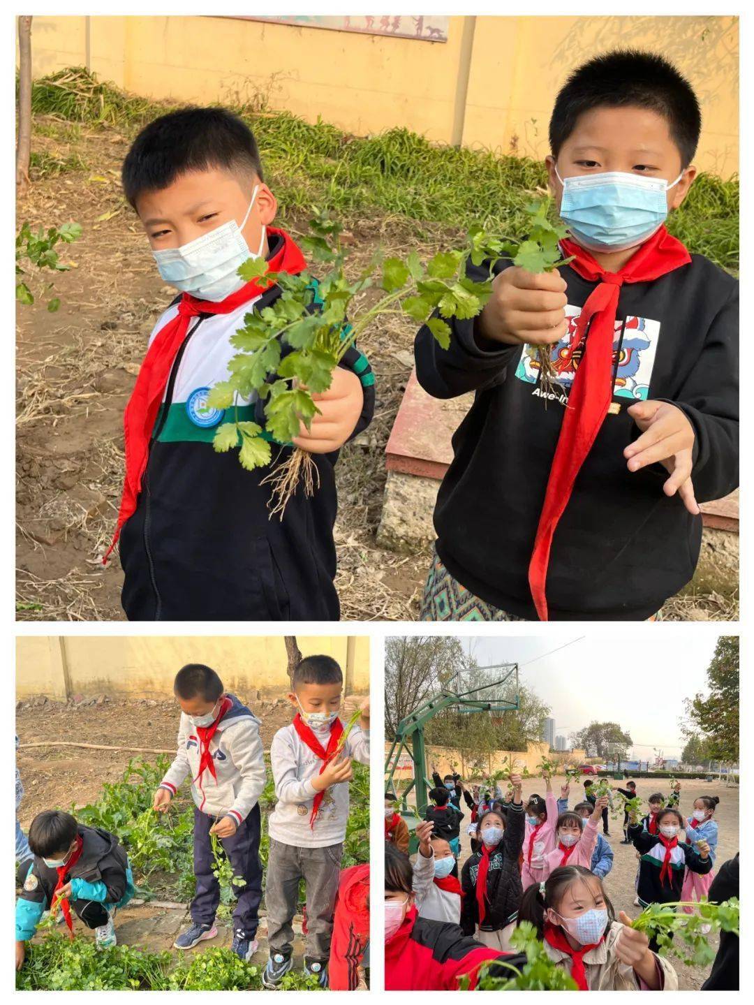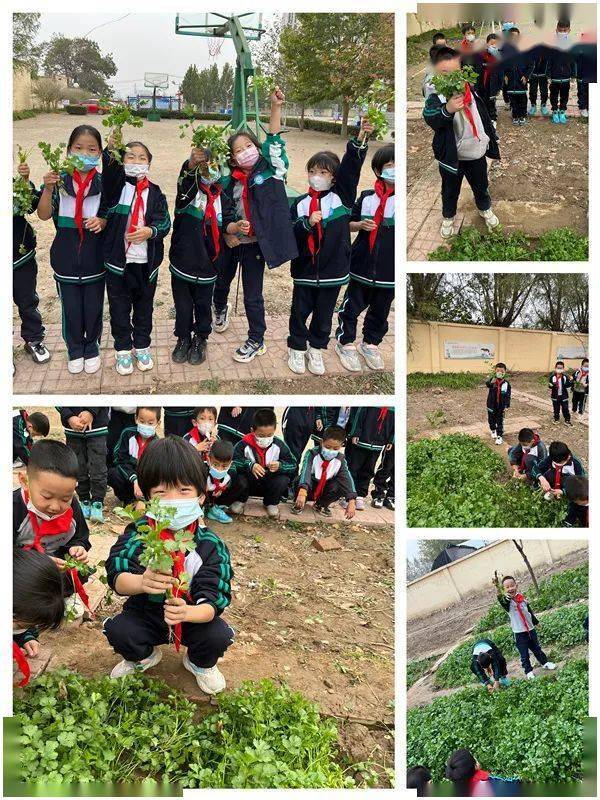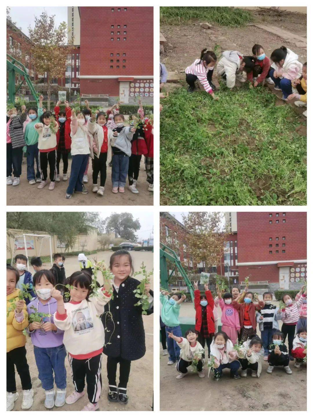 中年级的同学们围在了小白菜地边,在老师的指挥下开始有秩序地拔菜,抓住根部,用力一拔,连带起的泥土都散发着香甜的气息。还有的班级在老师的带领下开始拔起了胡萝卜,每位同学脸上都洋溢着丰收的笑容。