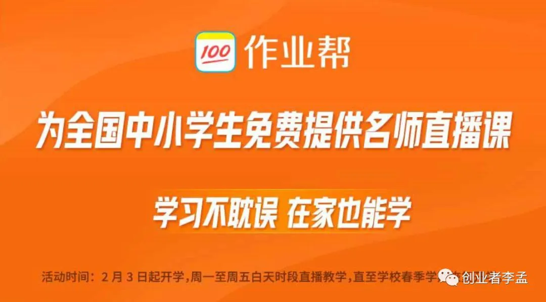 近期这个口号宣传很火热,目前入局网上课堂的机构越来越多,从阿里的钉钉、到很多在线交易平台例如微吼、EDUSohu、潭州课堂(职业兴趣为主)、沪江、腾讯课堂(职业兴趣为主)等等平台; 而今天我在微信公众号看到朋友圈广告以及文章广告也被作业帮所覆盖,邀请清华名师来授课,而且还制定了学习任务!各大平台推出免费学习和名师计划,岂能错过